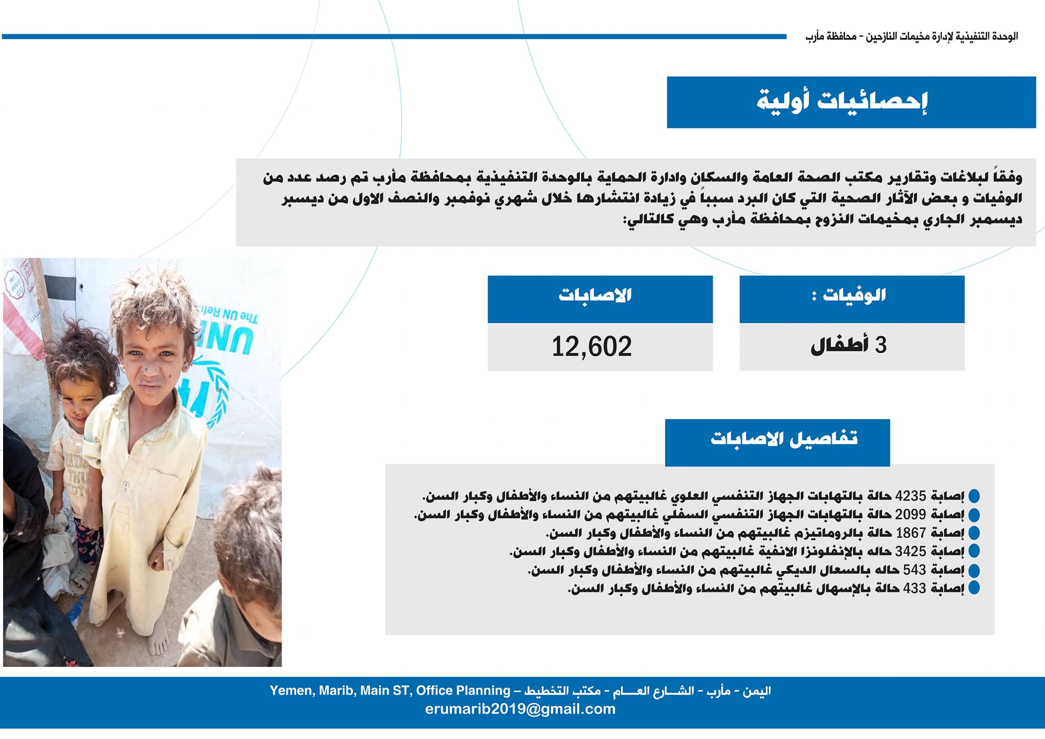 واوضحت انه نتيجة دخول فصل الشتاء وموجات البرد القارس في ظل الأوضاع المعيشية المتردية والصعبة في مخيمات النزوح بمحافظة مأرب، وفاقمت هذه الكارثة معاناة النازحين، وأدت إلى وفاة أطفال لم تحتمل أجسادهم الصغيرة تبعات النزوح وزمهرير الشتاء المميت.