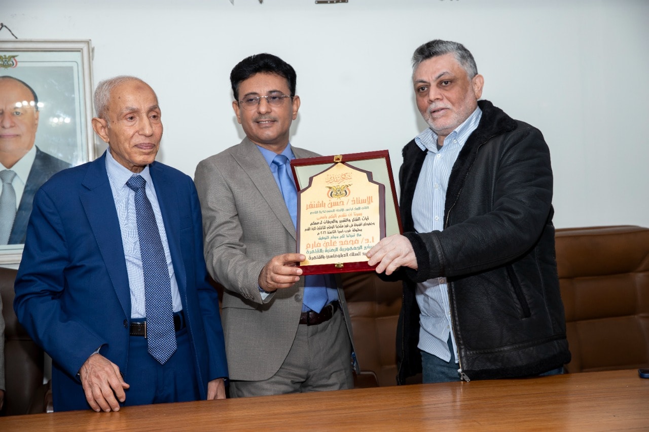 كما جرى تكريم النائب الاول لرئيس الاتحاد حسن باشنفر بدرع خاص من السفارة تقديرا لجهوده الملموسة في خظمة الكرة اليمنية .
