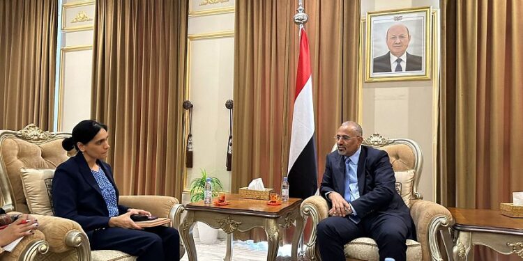 استقبل عضو مجلس القيادة الرئاسي اللواء عيدروس الزُبيدي، اليوم الخميس، السفيرة البريطانية لدى اليمن عبدة شريف أوبي، لمناقشة مستجدات الأوضاع الإنسانية في بلادنا والجهود الإقليمية والدولية الرامية لإنهاء الحرب، وبدء مسار سياسي يعالج قضايا الصراع المحورية ويؤسس لسلام مستدام في البلد والمنطقة بشكل عام.