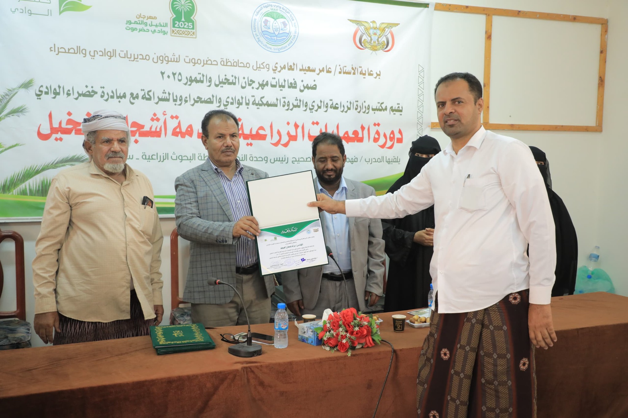 بدأت بمدينة سيئون محافظة حضرموت، اليوم، دورة تدريبية عن العمليات الزراعية لخدمة أشجار النخيل والتي نظمها مكتب الزراعة والري بوادي حضرموت والصحراء بالشراكة مع مبادرة خضراء الوادي ضمن أنشطة مهرجان النخيل والتمور للعام 2025م .