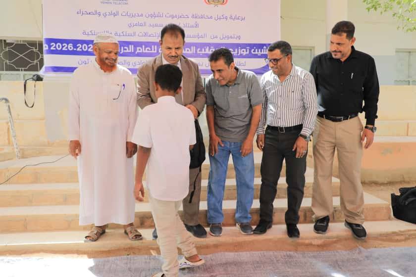 دشن وكيل محافظة حضرموت لشؤون مديريات الوادي والصحراء، عامر العامري، اليوم، توزيع الحقائب المدرسية للعام الدراسي 2025 – 2026م ، بتمويل من المؤسسة العامة للاتصالات السلكية واللاسلكية في اطار جهودها لدعم العملية التعليمية.