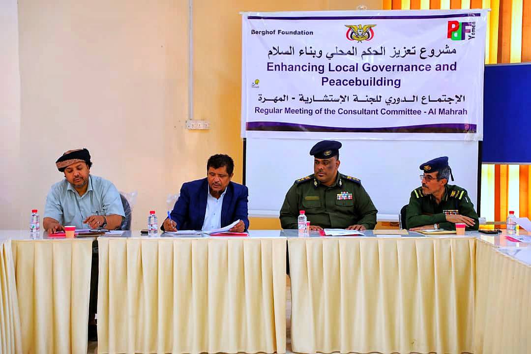 عقدت اللجنة الاستشارية بمحافظة المهرة، اليوم، اجتماعها الدوري برئاسة الأمين العام للمجلس المحلي سالم عبدالله نيمر ، رئيس اللجنة الاستشارية لتعزيز الحكم المحلي وبناء السلام، بحضور مساعد مدير عام الشرطة العقيد مراد محمد كلشات وعدد من القيادات الأمن بالمحافظة، لمناقشة مستجدات الأوضاع الأمنية.